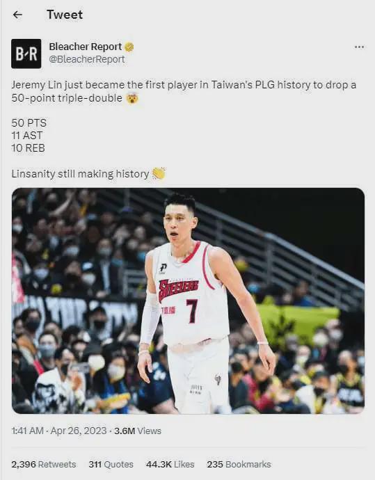 一开始,林书豪加盟的是弱队高雄钢铁人,他曾单场狂轰50分10篮板11助攻的超级三双,但带不动这支弱旅。