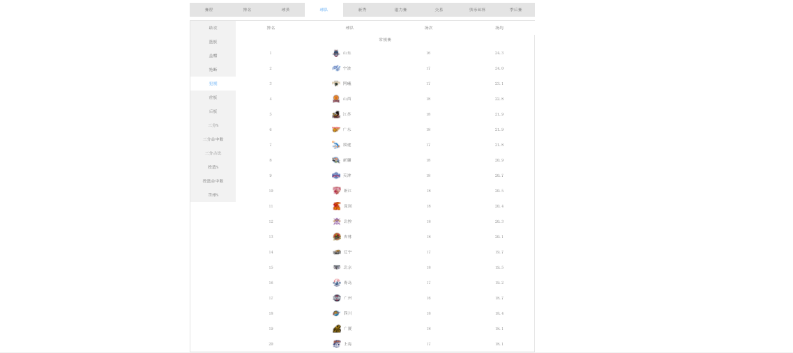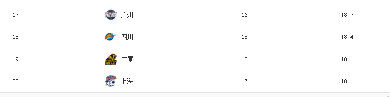 第4名-第16名分别是山西男篮(22.8次)、广东男篮(21.9次)、江苏男篮(21.9次)、福建队(21.8次)、新疆(20.9次)、天津(20.7次)、浙江(20.5次)、深圳(20.4次)、北控(20.3次)、吉林(20.1次)、辽篮(19.7次)、北京(19.5次)、青岛(19.2次)。